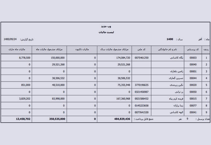 لیست مالیاتی حقوق یک لیست دارای اطلاعات حقوقی و مالیات حقوق هر یک از پرسنل شرکت می باشد. همانگونه که در مقاله مالیات حقوق ذکر شد، اگر پرسنل شرکت ها ماهیانه دستمزدی بیشتر از حداقل حقوق قانون کار دریافت کنند، موظف هستند که با توجه به مبلغ حقوق دریافتی که دارند مالیات حقوق خود را پرداخت نمایند.
