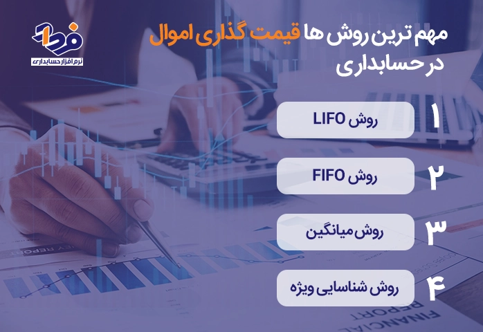 مهم‌­ترین روش­‌های قیمت گذاری اموال در حسابداری به 4 گروه و روش طبقه بندی می‌شود که در تصویر زیر آن‌ها را معرفی نموده‌ایم.