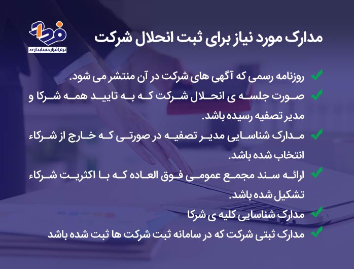 از جمله مدارکی که برای ثبت انحلال شرکت مورد نیاز است در تصویر زیر ذکر شدهاند: