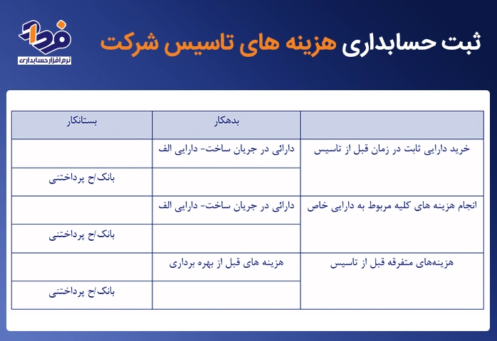 هزینههای مربوط به تأسیس شرکت شامل هزینههای حقوقی، ثبت شرکت، تبلیغات اولیه و غیره میشود. این هزینهها معمولاً بهصورت زیر ثبت میشوند: