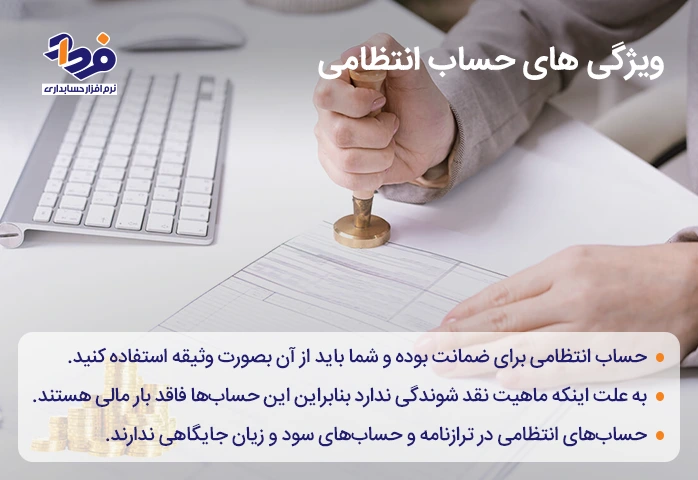 ویژگیهایی که در حسابهای انتظامی وجود دارد، موجب شده تا حساب انتظامی با سایر حسابها متفاوت باشد، ویژگیهای این حساب را در تصویر زیر شرح دادهایم.
