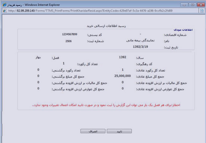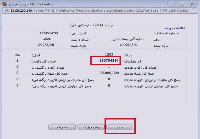 پس از ثبت فرمی برای کاربر نمایش داده می شود، که رسید اطلاعات بوده و با انتخاب گزینه تایید کد رهگیری برای شخص ارسال شده و گزینه چاپ رسید نیز فعال خواهد شد.