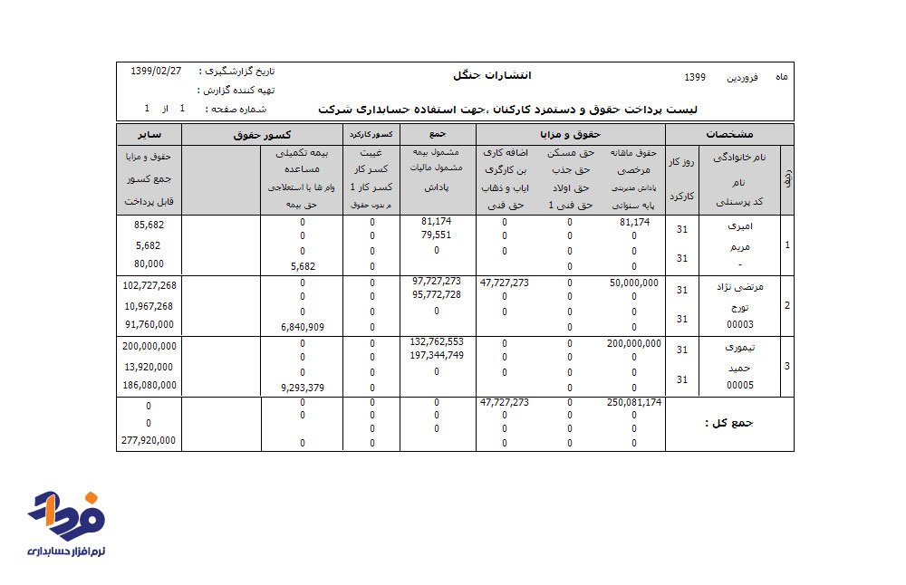 - این لیست را میتوانید به کارمندان ارائه دهید و همزمان با پرداخت حقوق، از آنها رسیدی مبنی بر صحت اطلاعات و محاسبات دریافت نمایید تا در آینده دچار مشکل نشوید. در عین حال میتوانید آن را نزد خود نگه داشته و آرشیو نمایید تا در مواقع لزوم از آن استفاده کنید.