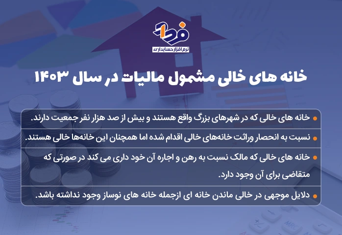 خالی ماندن خانه علاوه بر این که سبب جلوگیری از ورود سرمایه به اقتصاد می­‌شود، سبب افزایش قیمت مسکن، قیمت رهن و اجاره و در نهایت کمبود مسکن نیز می‌گردد، در نتیجه یکی از راهکارهای جلوگیری از این پدیده تصویب مالیات بر خانه­‌ های خالی است. خانه‌هایی که در سال 1403 مشمول این مالیات می‌شوند را در تصویر زیر شرح داده‌ایم.