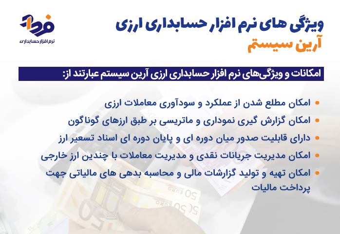 نرم افزار حسابداری ارزی به شما کمک میکند، روابط تجاری خود را گسترش دهید و با ارز کشورهای دیگر فعالیت و سرمایه گذاری کنید، به همین خاطر شرکت نرم افزاری آرین سیستم، نرم افزاری در این زمینه طراحی و روانه بازار نموده است که شما را در امور حسابداری ارزی یاری مینماید.